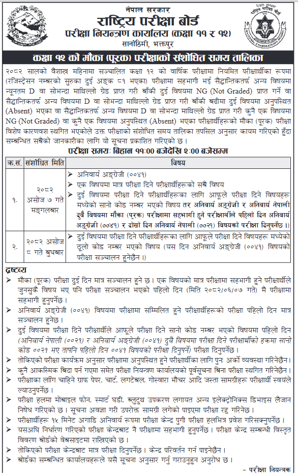 नयाँ तालिका अनुसार मौका परीक्षा यही असोज ७ गते र ८ गतेका लागि तोकिएको छ ।