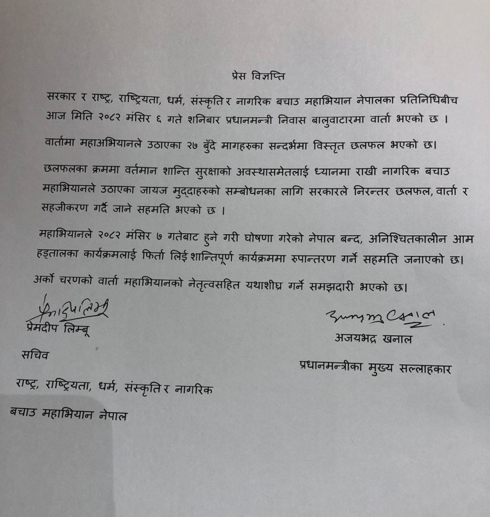 महाभियानले २०८२ मंसिर ७ गतेबाट हुने गरी घोषणा गरेको नेपाल बन्द, अनिश्चितकालीन आम हड्तालका कार्यक्रमलाई फिर्ता लिन सहमति जनाएको छ।