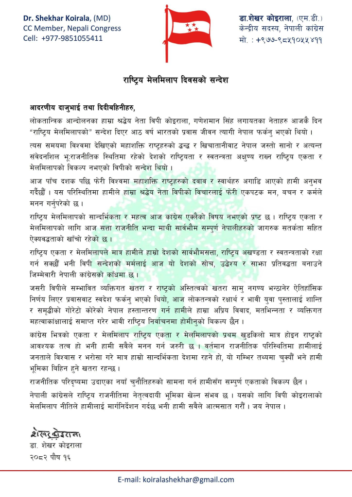 डा. कोइरालाले वर्तमान परिस्थितिमा राष्ट्रिय एकता र मेलमिलापको आवश्यकता झनै बढेको उल्लेख गरेका छन् ।