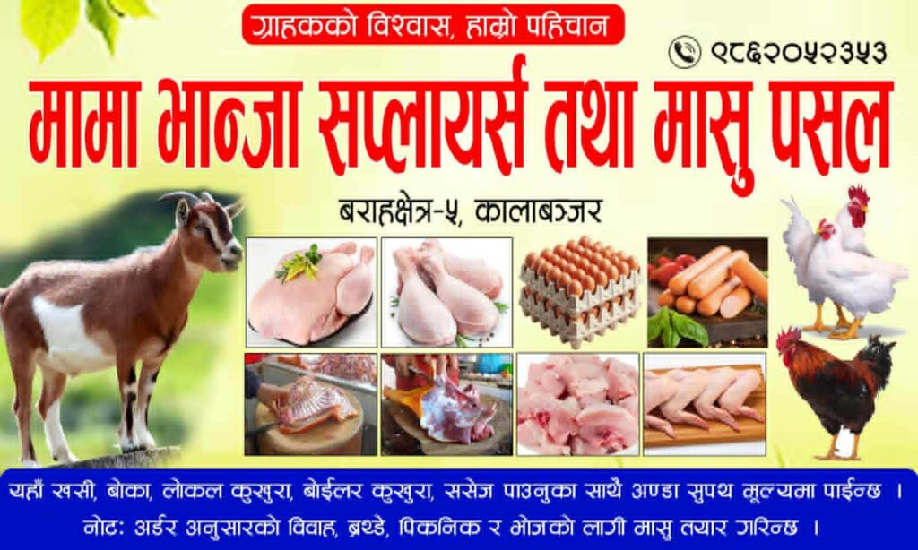 सुनसरी, सुनसरीको वराहक्षेत्र नगरपालिका ५, कालाबांजारमा मामा/भान्जा सप्लायर्स तथा मासु पसल सञ्चालनमा आएको छ ।