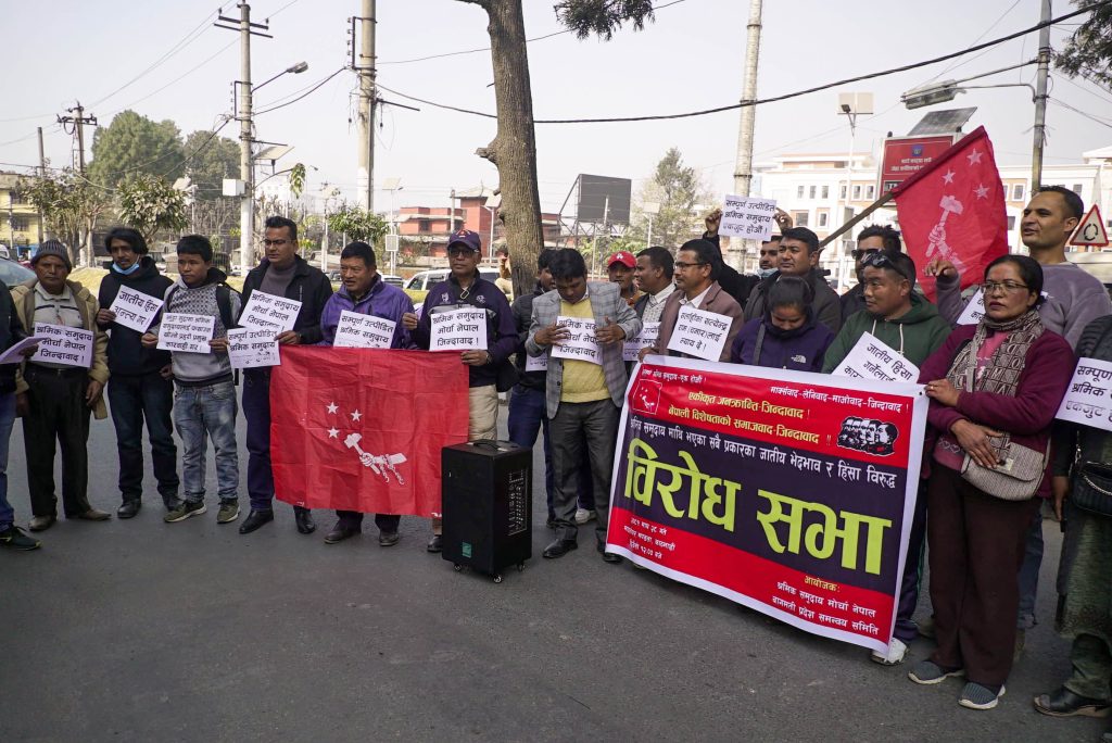 श्रमिक समुदायमाथि भएका सबै प्रकारका जातीय भेदभाव र हिंसा विरुद्ध मोर्चा नेपाल बागमती प्रदेश समन्वय समितिले प्रदर्शन गरेको हो । उनीहरूले प्रदर्शन गृहमन्त्री रमेश लेखकको राजीनामा समेत मागेका छन् ।