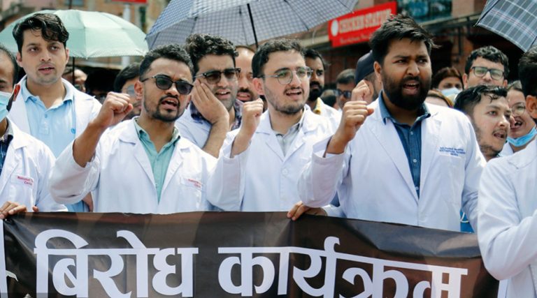 प्राइभेट मेडिकल कलेजहरूले सेवा सुविधा दिन नमानेको भन्दै स्वास्थ्यकर्मीहरूको माइतीघरमा धर्ना