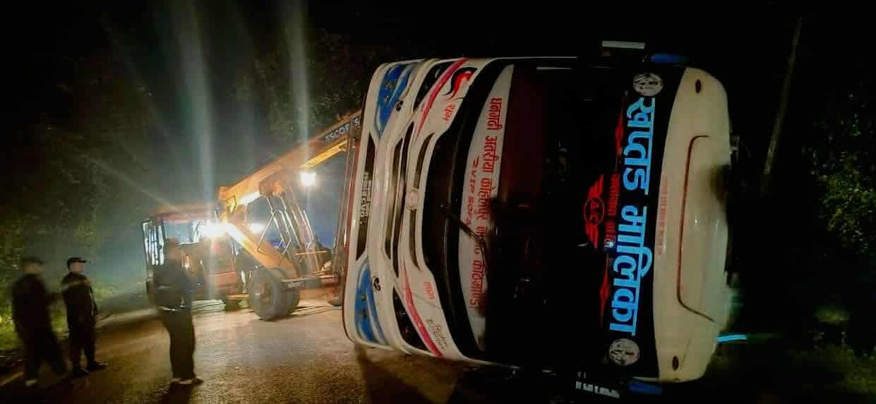 काठमाडौँबाट धनगढीतर्फ जाँदै गरेको बा.प्र.०१–००६ ख ८५०६ नम्बरको यात्रुबस अनियन्त्रित भई सडकमा पल्टिँदा दुर्घटना भएको हो ।